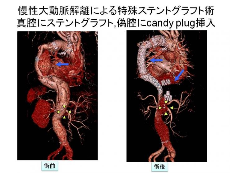 慢性期に動脈解離部分が瘤化した慢性大動脈解離(解離性大動脈瘤)に対しての治療は、人工心肺を使用し人工血管に置換されます。しかし大動脈解離部分すべてが治療されるわけではないため、残存した解離血管のほとんどはそのままの状態で残っています。慢性大動脈解離に対する人工血管置換術は、成績が悪いことも有り、最近ではステントグラフト術を行う場合もあります。将来的に残った解離腔が拡大し、破裂しないように、血圧の管理、生活習慣病の予防などの厳重な管理が必要です。そのため、定期的に通院加療が必要になります。