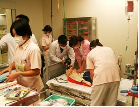 医師・看護師だけでなく、病院に勤務する職員全員が、緊急時に何をするべきか考えて行動できるように訓練を行っています。